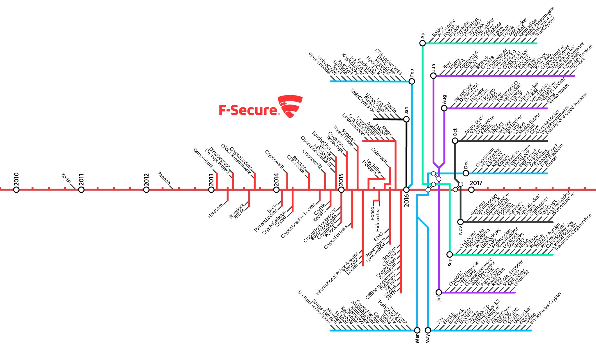 Klik op de afbeelding voor een overzicht van F-secure om je een beeld te geven van alle cryptolockers tot begin 2017.